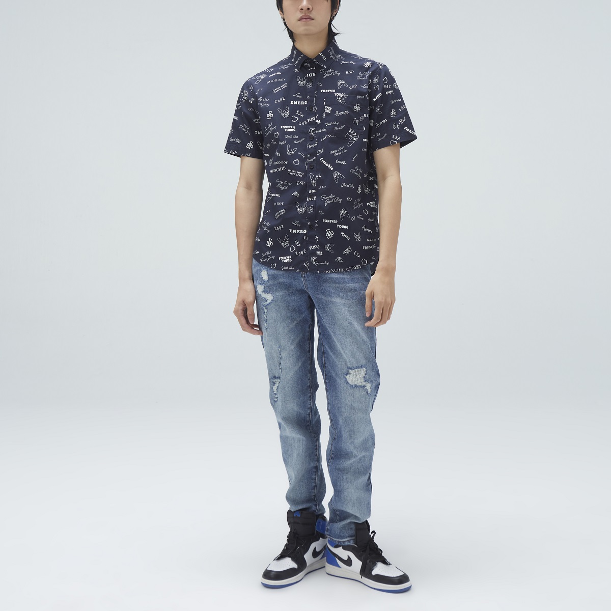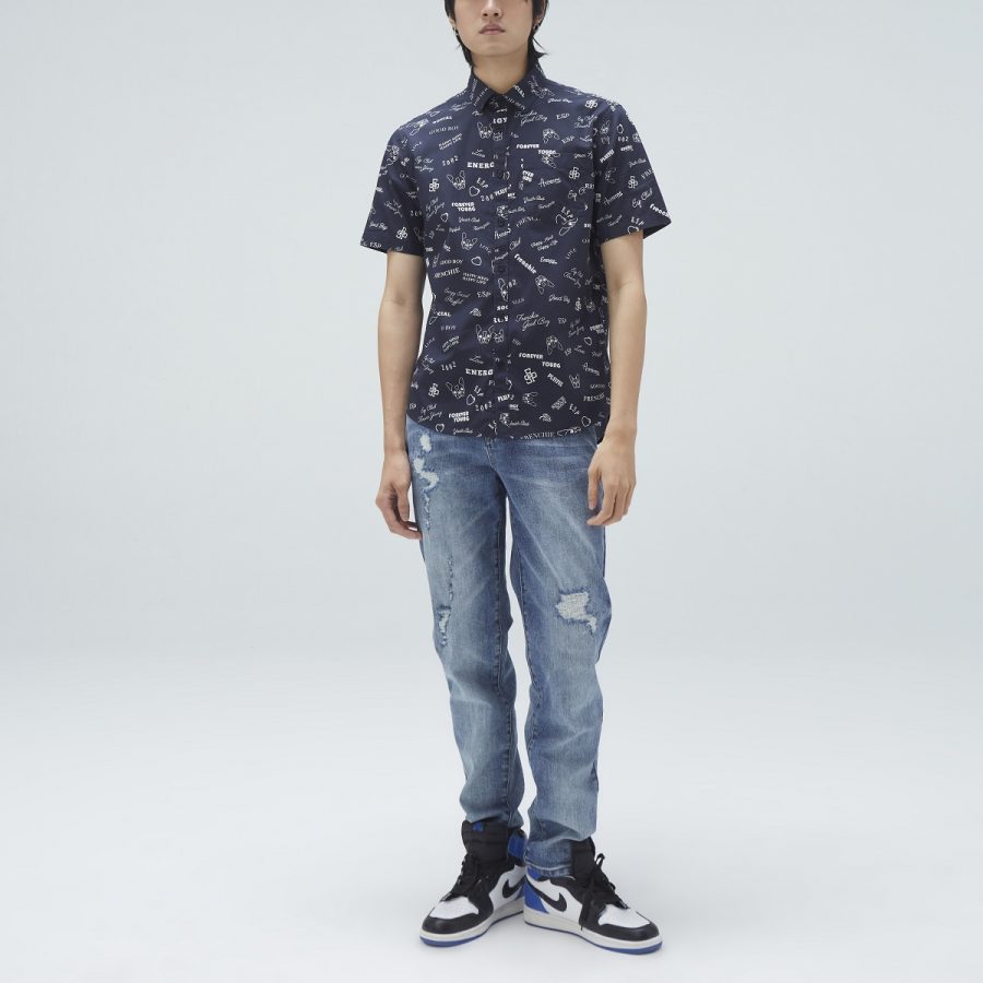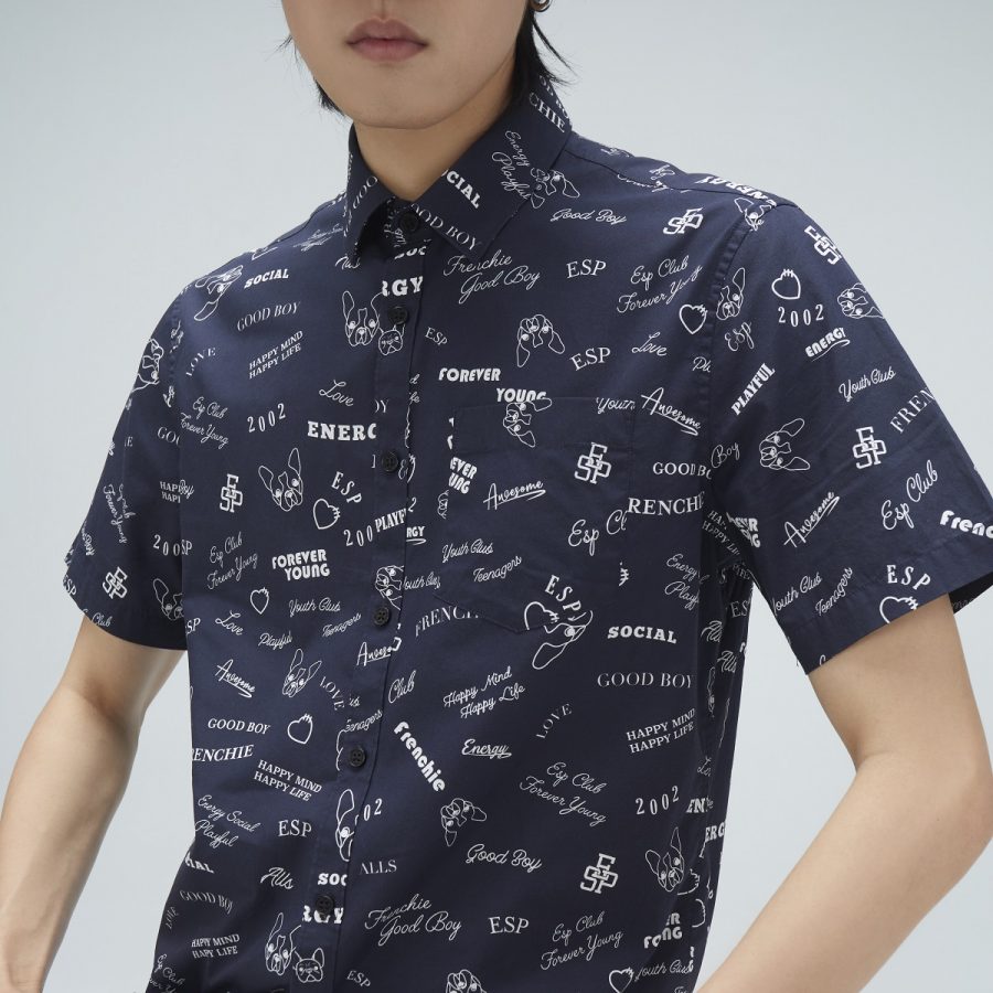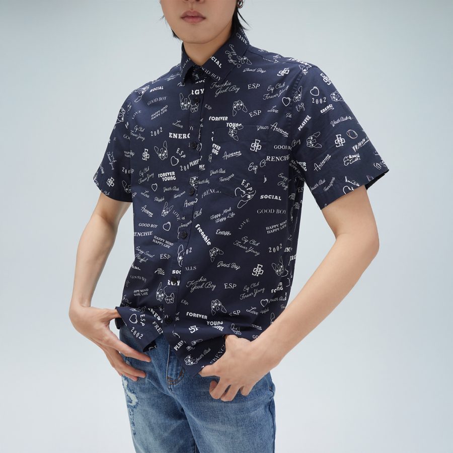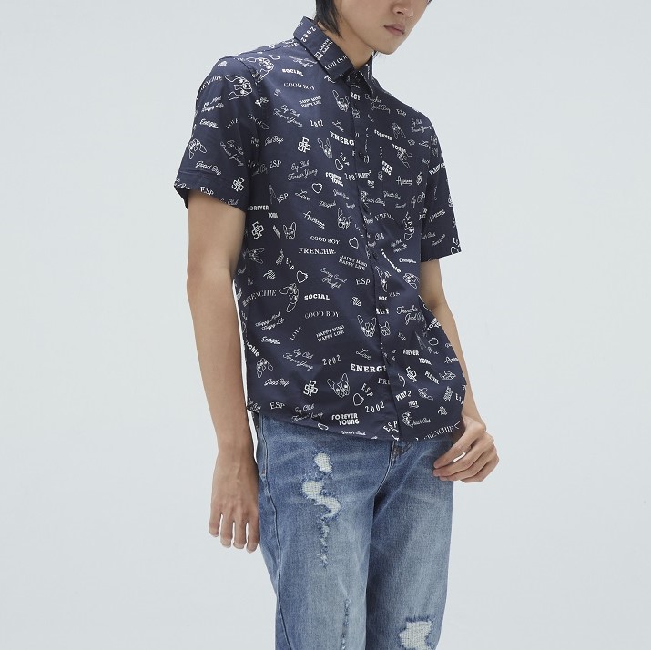เสื้อเชิ้ตฮาวาย เฟรนช์ชี่ สีน้ำเงิน สกรีนลายกราฟฟิกตลอดทั้งตัว ลวดลายสนุกสนาน เนื้อผ้านุ่น ใส่แล้วเย็นสบาย เหมาะสำหรับอากาศเมืองไทย แมทช์คู่กางเกงสีพื้นได้ทั้งขาสั้น และขายาว