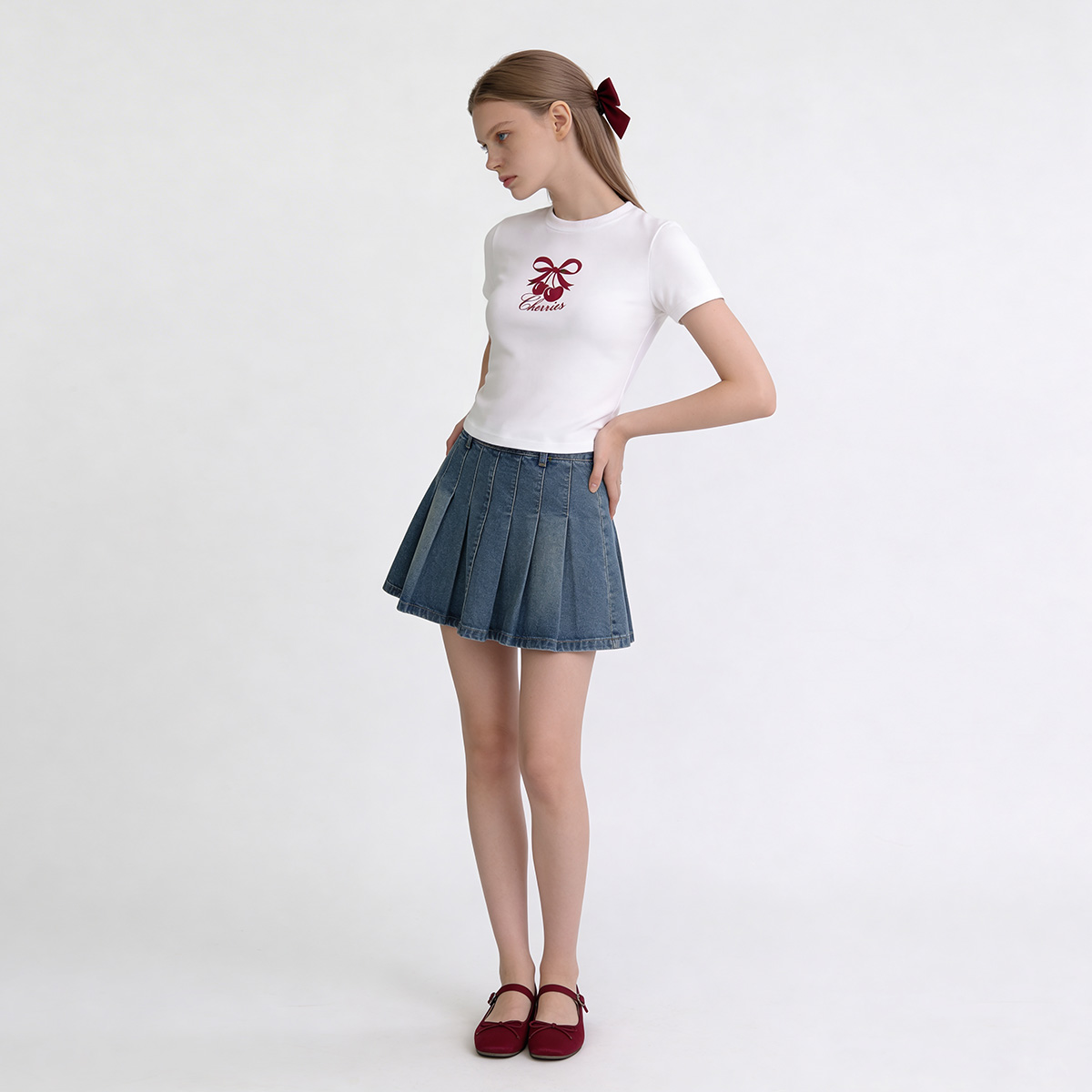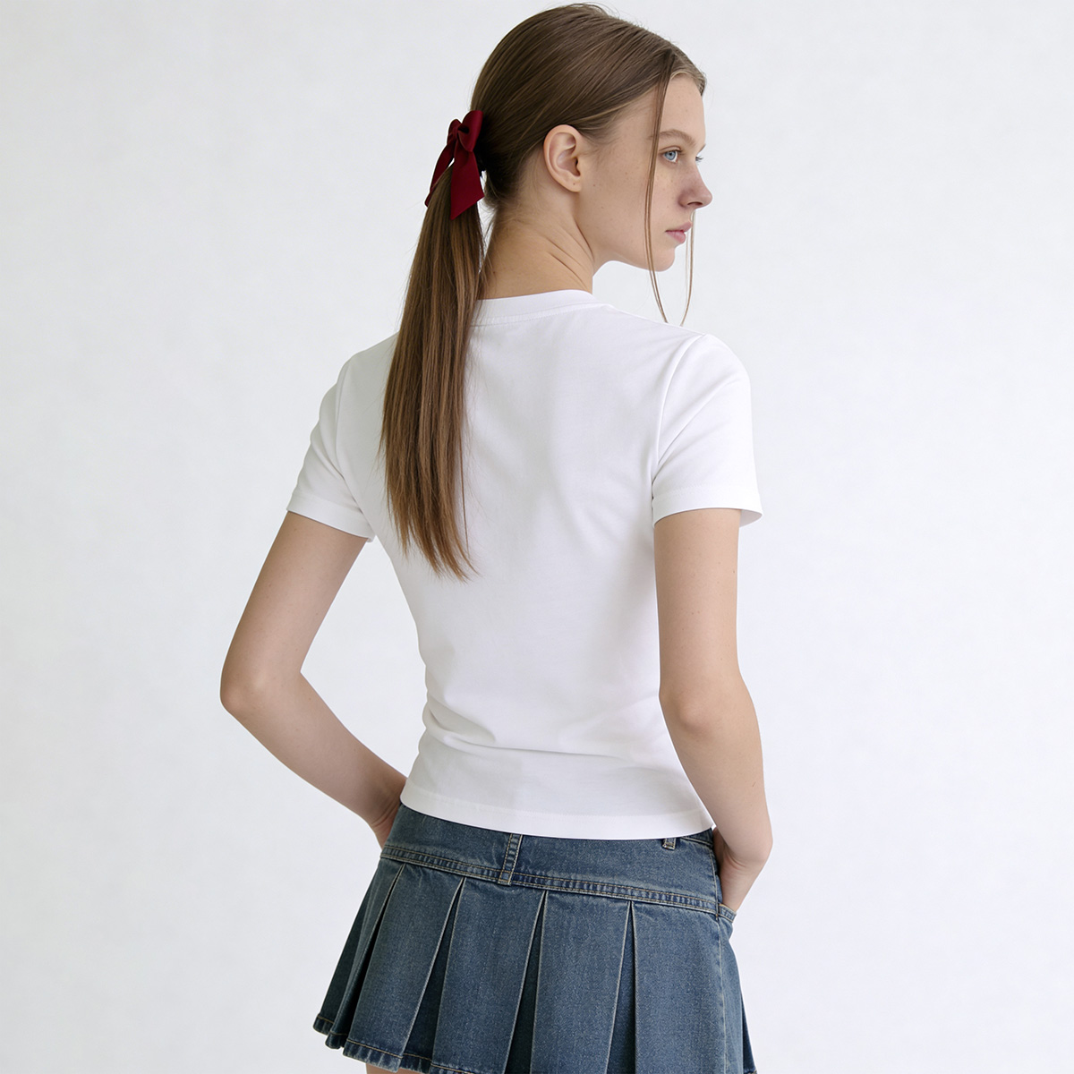 – เสื้อทีเชิ้ตโทนสีขาวคอกลม แขนสั้น