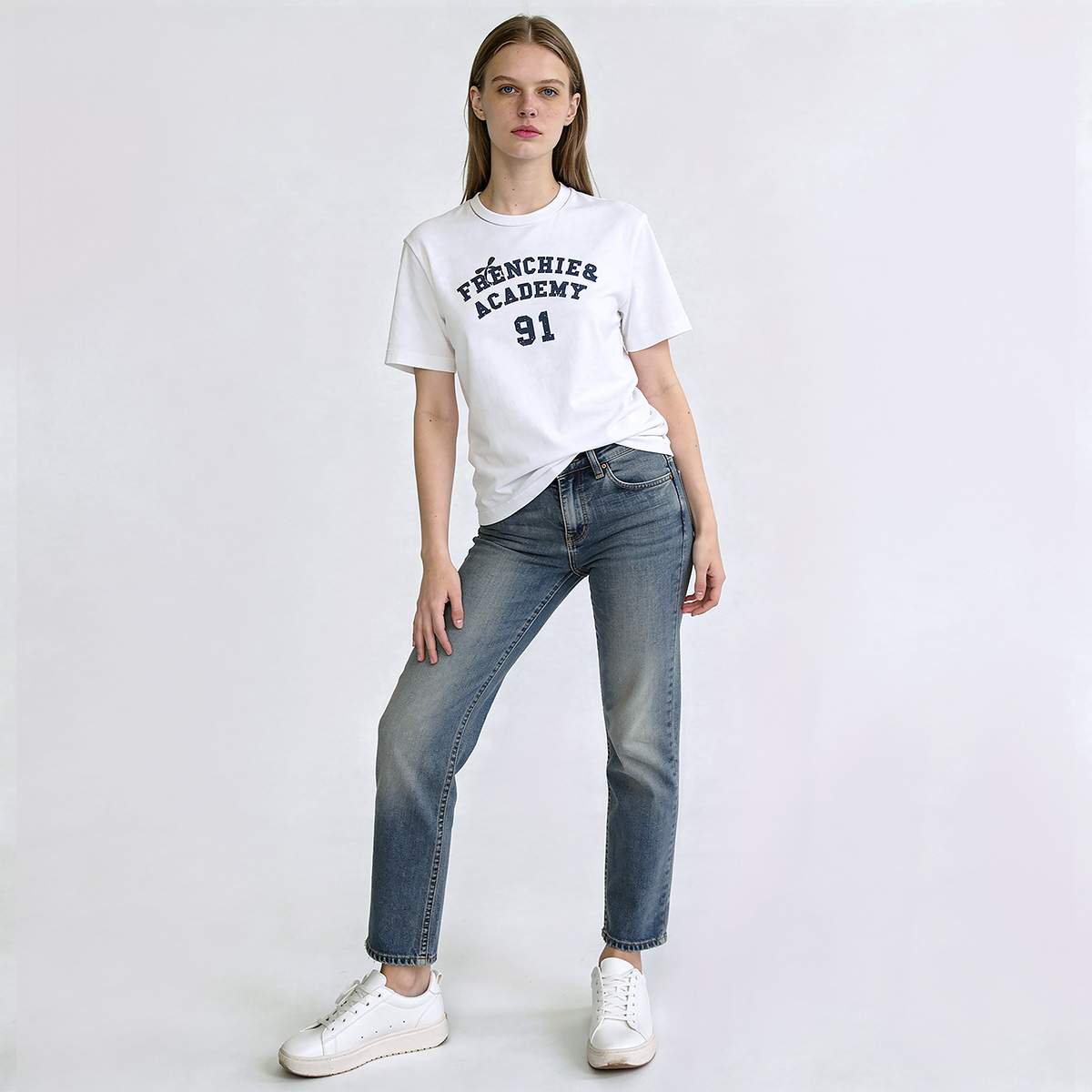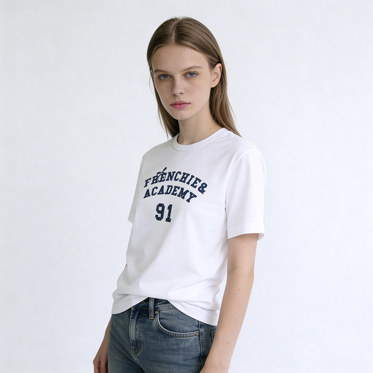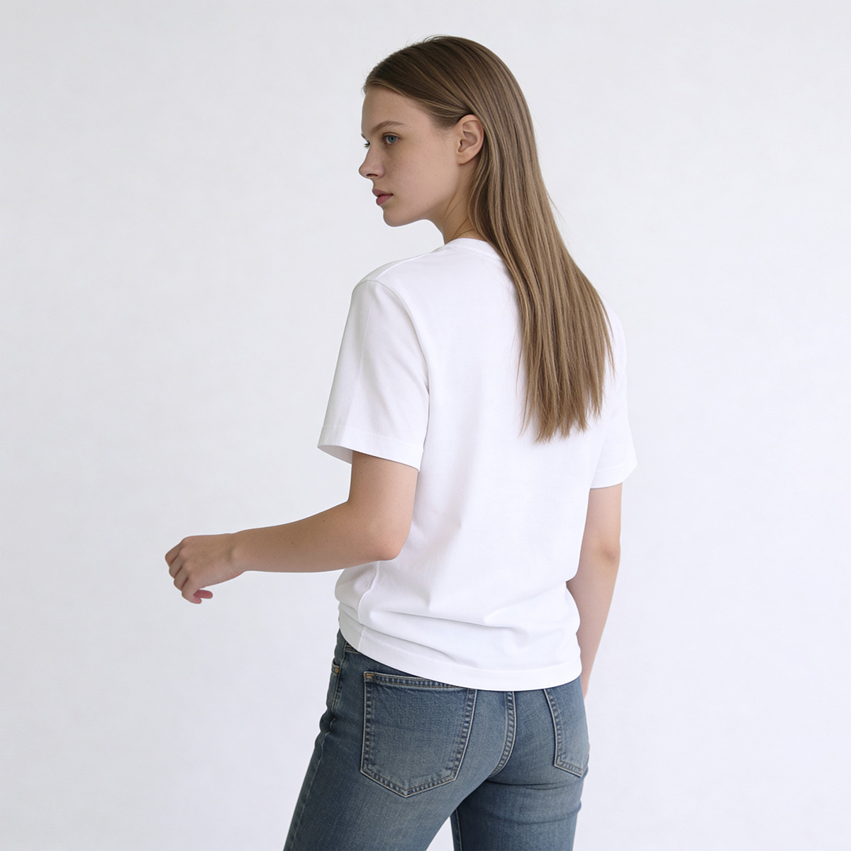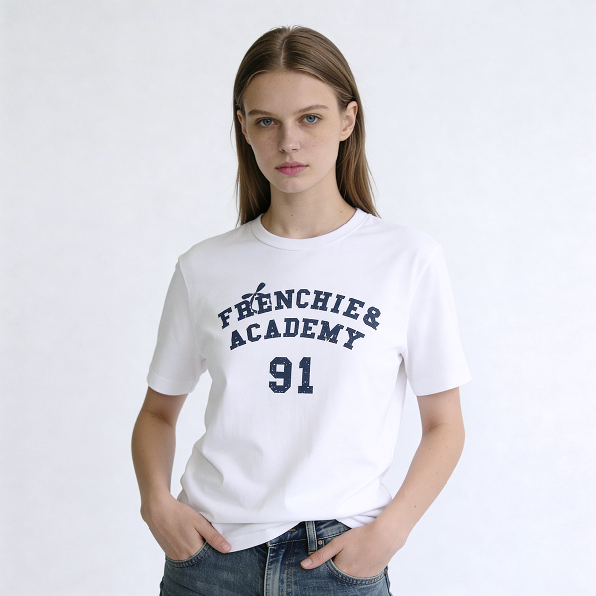 – เสื้อทีเชิ้ตโทนสีขาวคอกลม แขนสั้น