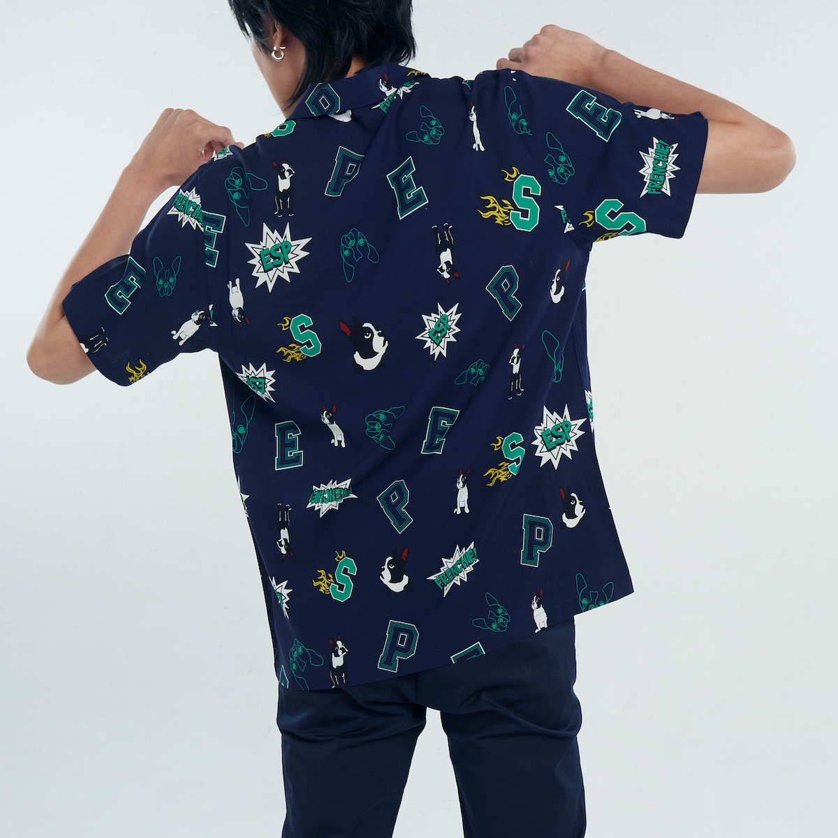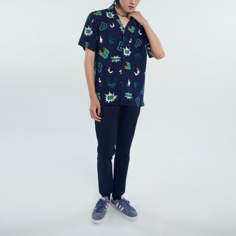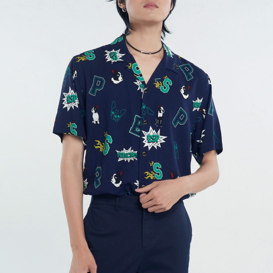 เสื้อเชิ้ตฮาวาย สกรีนลายกราฟฟิกตัวอักษรภาษาอังกฤษตลอดทั้งตัว ลวดลายสนุกสนาน เนื้อผ้านุ่ม ใส่แล้วเย็นสบาย เหมาะสำหรับอากาศเมืองไทย แมทช์คู่กางเกงสีพื้นได้ทั้งขาสั้น และขายาว